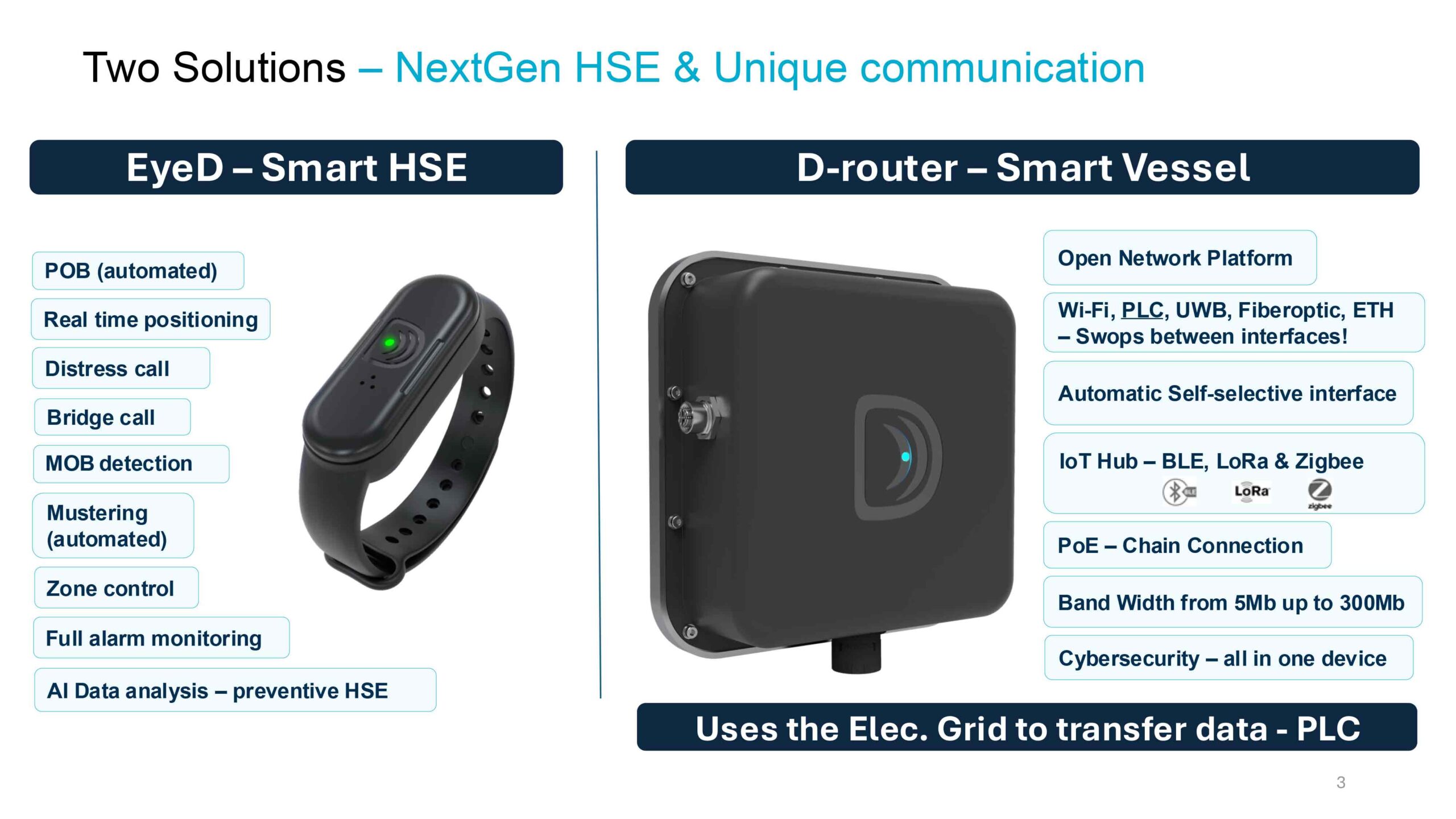 - EyeD: Et sanntids posisjoneringssystem, i form av et enkelt sikkerhetsarmbånd for mannskap og passasjerer. Det er fullt tilpassbart, med ulike konfigurasjoner, og tilbyr 24/7 overvåkning, Mann Over Bord-deteksjon (MOB), nødknapp, toveiskommunikasjon og automatisert mønstring samt gangvei-kontroll. En viktig funksjon er sonekontroll, som gir mulighet til å overvåke eller begrense tilgangen til risikoområder.